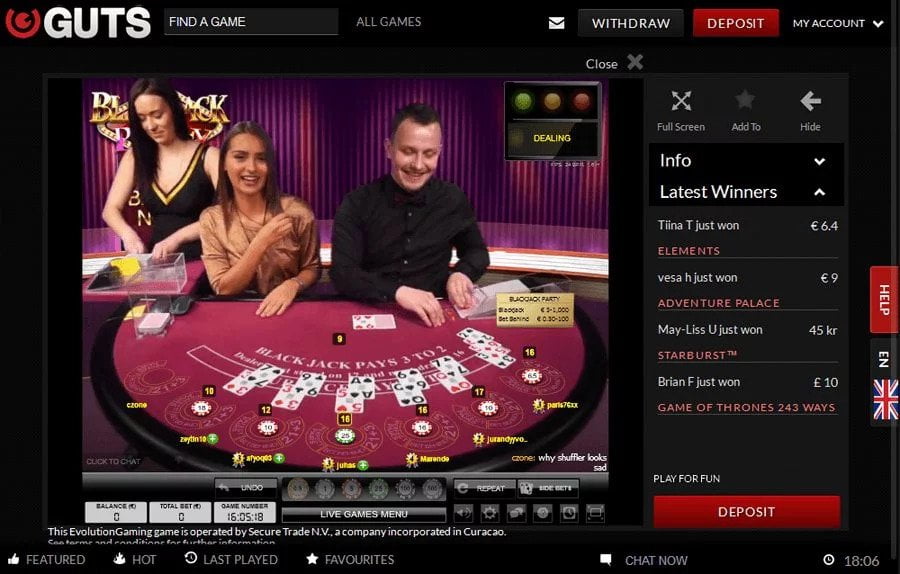 Guts Casino est le genre de casino où les gens vont quand ils veulent passer un bon moment et laisser tout traîner. Pour cette raison, les gens sont constamment dans ce casino pour essayer de prouver leurs tripes car il a été conçu pour défier le joueur et le forcer à passer le meilleur moment de sa vie. Ces mêmes joueurs pourraient même vouloir défier leurs amis à quelque chose qui les aidera tous à gagner plus d'argent.